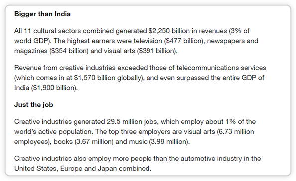If you are an Industry Creative…What is creativity worth to the world economy? $2,250 billion is the answer, and Moto Theme has a ready to plug in demo just for that as well, or you can build up a custom one if you prefer, all within just a few minutes of your time, and with no coding skills whatsoever.